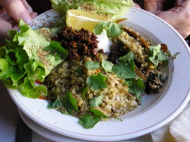 On my first visit, I had a vegetarian dish of brown rice, quinoa, marinated fava beans, fresh chutney, sun dried tomato and mixed greens.